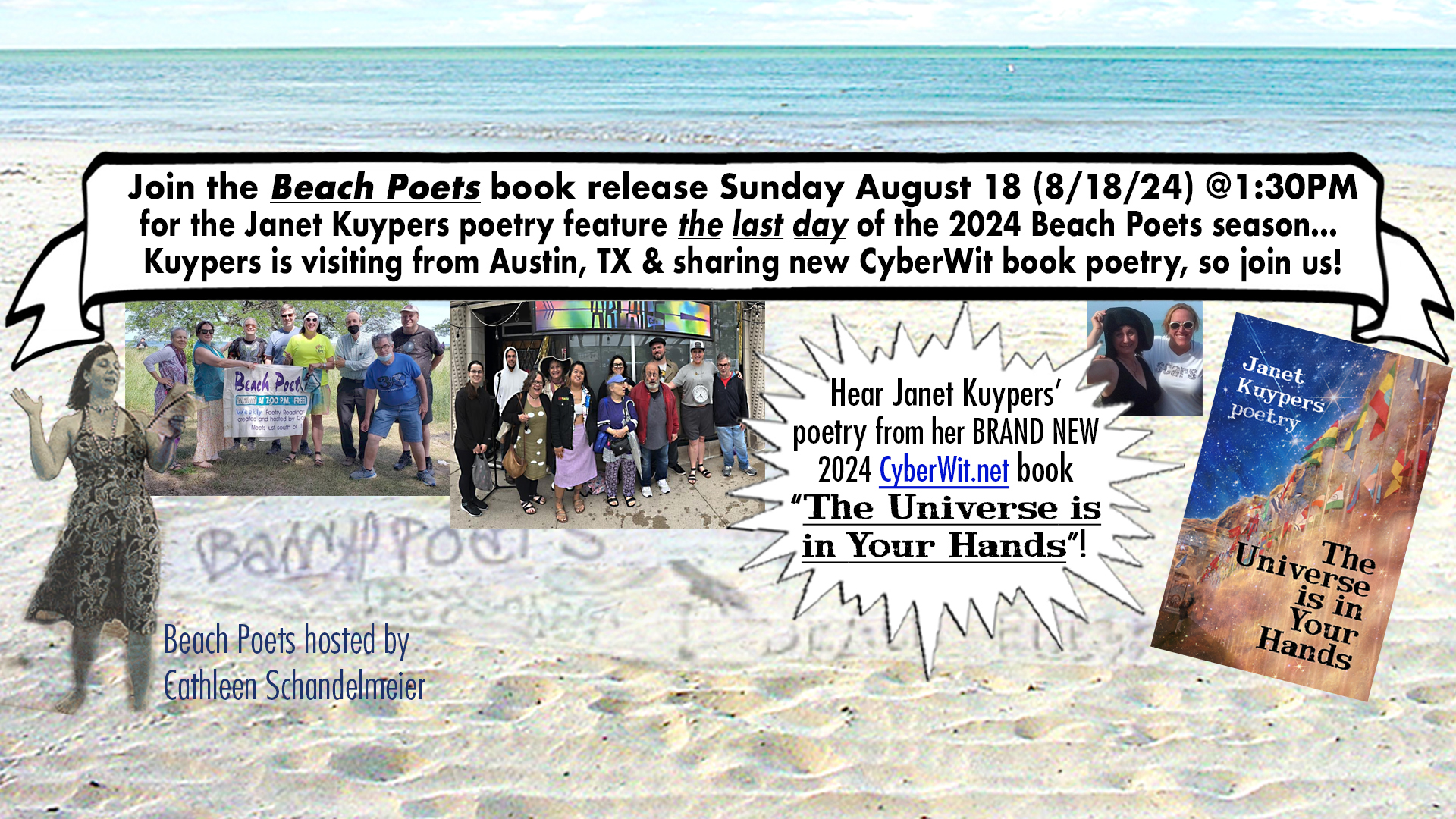 Enjoy this YouTube video of Janet Kuypers’ “The Universe is in Your Hands” poetry book “Beach Poets and Janet Kuypers feature on 8/18/24”, reading her poems “Poetry on a Stick”, “Uniqueness Finds Love”, “Out Toward the Horizon”, “Finally Found Home”, “Big Shoulders: This Was Her Home”, “Choices we Make”, “Culture Woven into Cloth”, “One Summer: Arizona”, “On a Mission for This Reprieve”, and “Original Snowbirds”, in Chicago (this video was filmed from a Panasonic Lumix 2500 camera; on Facebook, Twitter/X, Linkedin, Pinterest, Instagram, and Tumblr). #janetkuyperstheuniverseisinyourhands #janetkuyperspoetry #janetkuypersbookreading |